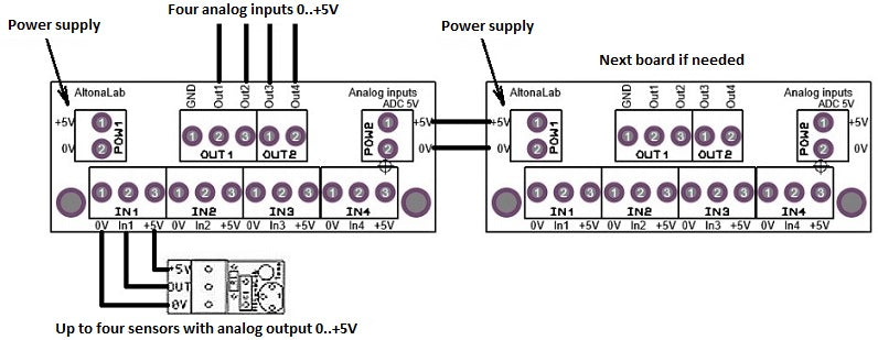 The connector board can be used to connect up to four sensors with analog outputs 0..5V to analog inputs (ADC), which work in range 0..5V.