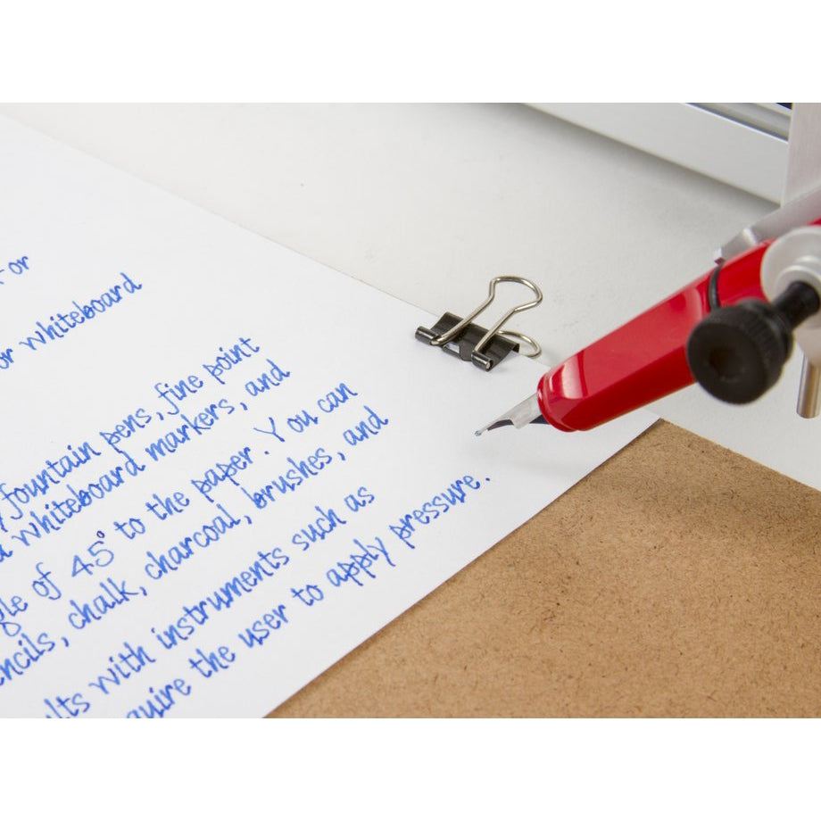 The pen holder fits a wide variety of pens, including Sharpie fine and ultra-fine point markers, most rollerball and fountain pens, small-bodied whiteboard markers, and so forth. It can even hold a fountain pen at a proper angle of 45° to the paper. You can also use implements that aren't pens, such as pencils, chalk, charcoal, brushes, and many others. However, you'll get the best results with instruments such as fountain pens and rollerball pens, which do not require the user to apply pressure.
