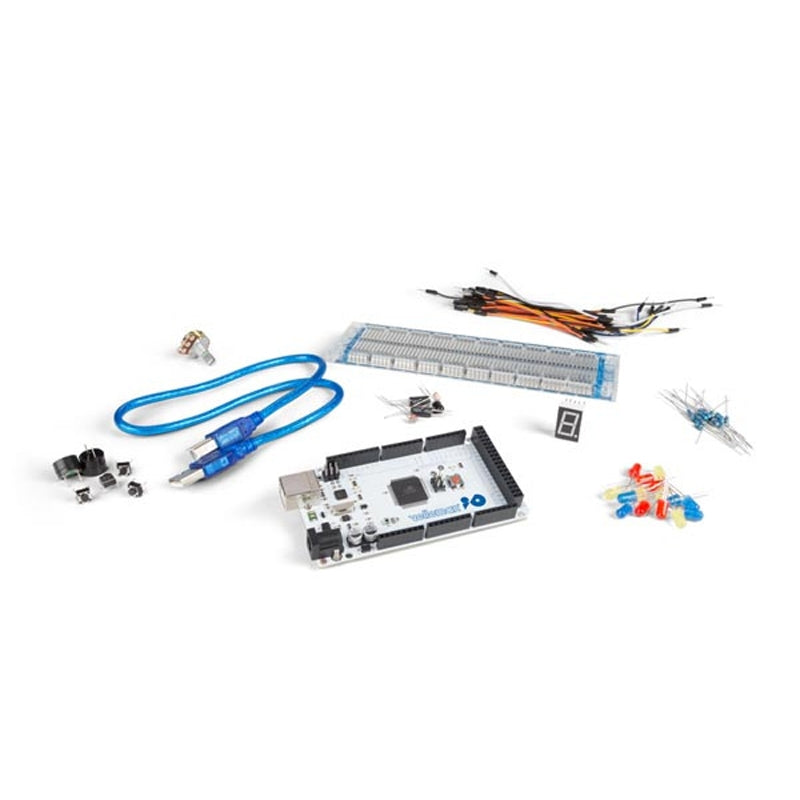 Comes with a breadboard, jumper wires, LEDs, etc.
