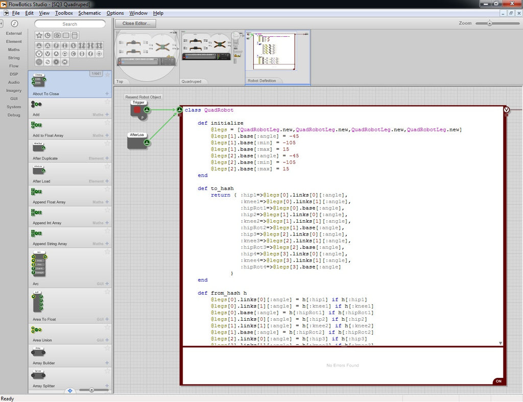 Using the FlowBotics Studio programming language is as easy as dragging new components out of the library into the project's schematic, and making green links to connect one component's output of another one's input. FlowBotics Studio even has support for writing custom modules in Ruby, a traditional procedural language.
