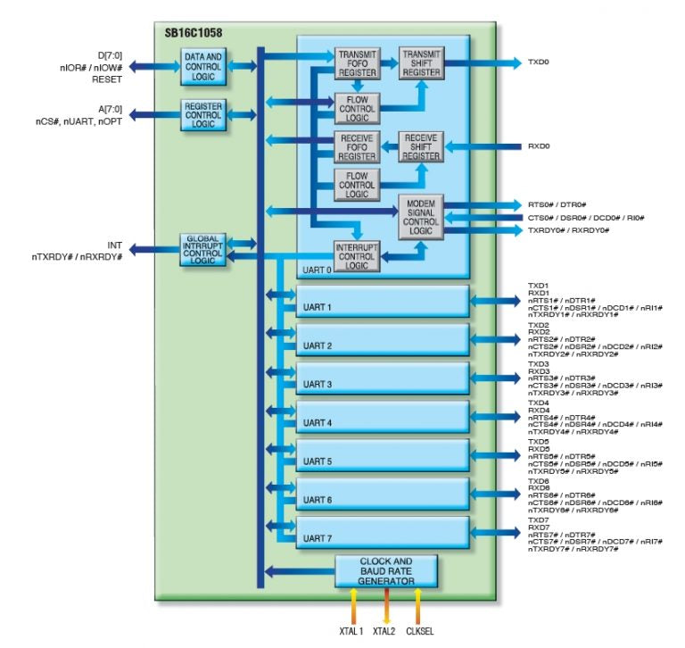 SB16C1058 is an Octal-UART (Universal Asynchronous Receiver and Transmitter) semiconductor, which has 256-Byte FIFO and eight UART Channels supporting automated bus input/output signal control. It operates on SystemBase MIO Bus compatible MIO mode and can be expandable up to 32 ports. Thanks to these new features, MOQ can be lowered than more than 25% and overrun error has been eliminated using large FIFO which improves overall performance.