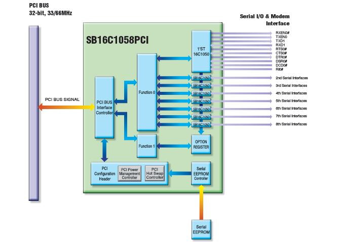 SB16C1058PCI is a single chip which enables 8 asynchronous serial communication ports to be connected to the PCI bus without any glue logic and it is the best solution to constitute a serial port for the PCI bus. It allows customers to make easy and simple reference design as a one-chip solution for 8-port serial multi-port cards.