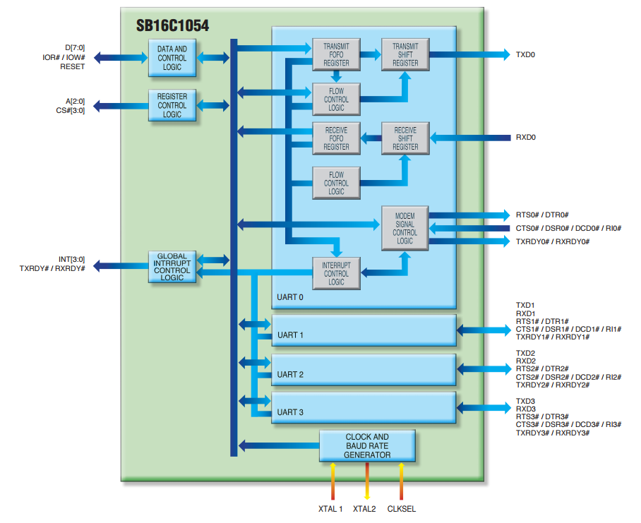 SB16C1054 is a Quad-UART (Universal Asynchronous Receiver and Transmitter) with 256-byte FIFOs, automatic hardware/software flow control, and can transmit and receive the data up to 5.3 Mbps. The 256-byte FIFOs reduce CPU overhead, allowing higher data rate and data throughput. In addition to the increased FIFO size and data rate, SB16C1054 also provides the enhanced features. It has the registers for reducing interrupt signal control logic and storing threshold levels of receive FIFO to start/stop transmission during hardware and software flow control.