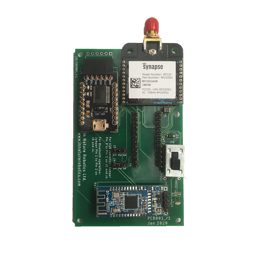 The RF220 Evaluation Board uses a long range 2.4 GHz wireless transceiver from Synapse Wireless to extend the range of wired USB or Bluetooth data connections. It can be plugged into an available USB port on a computer and used as a wireless serial port or you can connect to it via Bluetooth (Bluetooth Low Energy or BLE) using an Android or iOS Device. The transceiver used is the RF220SU from Synapse Wireless, which includes A to D inputs, digital I/O, and many programmable features. A 2 x 12 header is provided for making easy connections to all the available pins on the RF220SU.