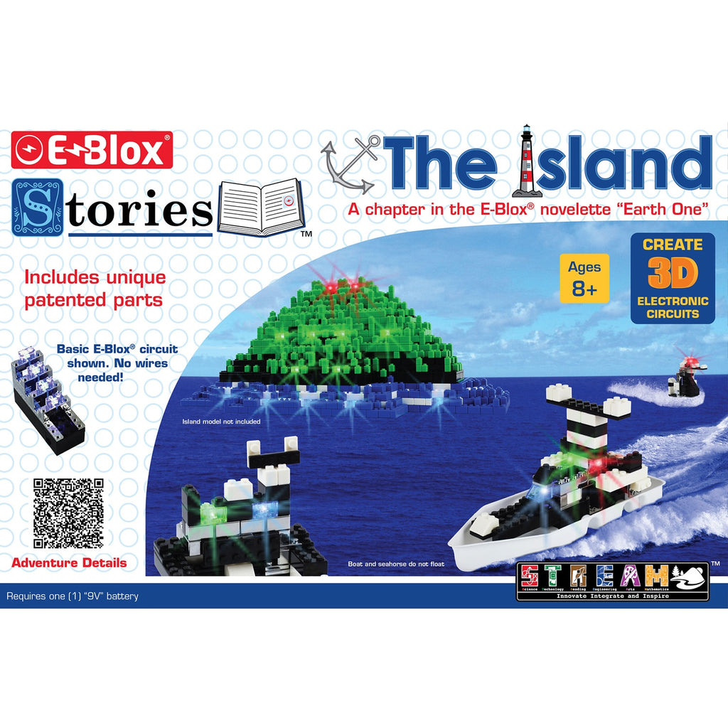 The Stories - The Island E-Blox Set is a chapter in the E-Blox novelette "Earth One". Follow the adventures of Seymour and his robot Robyn as he investigates a mysterious light in the distant ocean horizon.