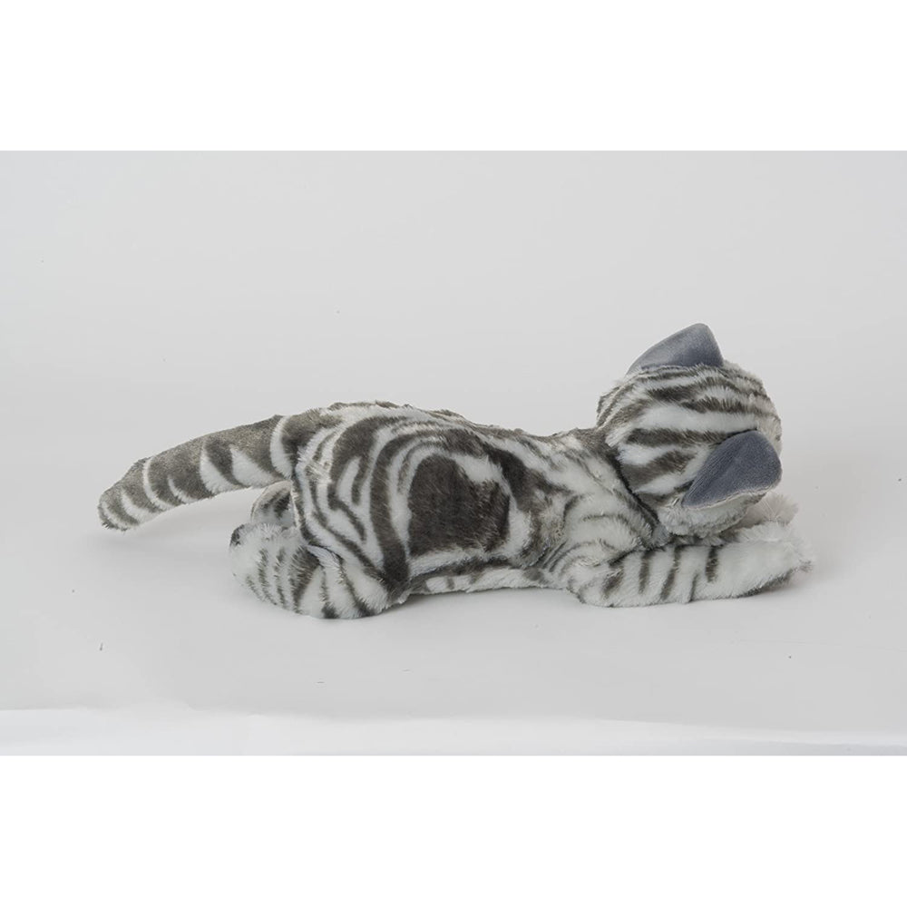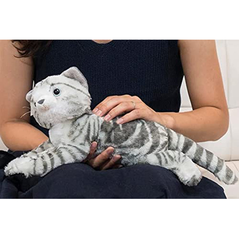 The Trendmaster Interactive Plush Robot Cat Gray Stripes is an interactive cat toy that features four static sensors on the head, chin, back, and tail. These sense the difference between touching and stroking and change the meow sound accordingly.