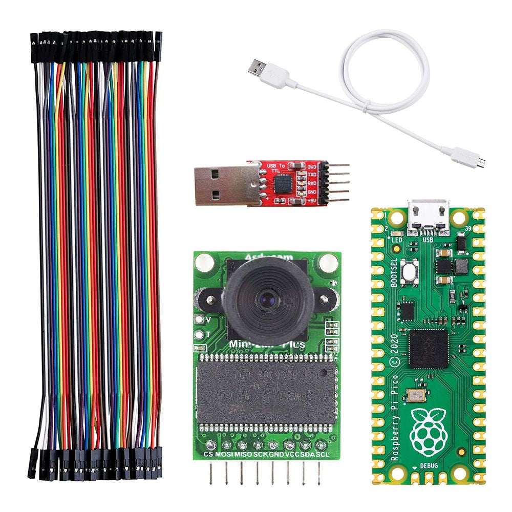 It also includes the Arducam Mini 2MP Plus OV2640 SPI camera module. The Arducam is a general-purpose solution compatible with multiple platforms, include Arduino, ESP32, and the Raspberry Pi Pico we’re using.